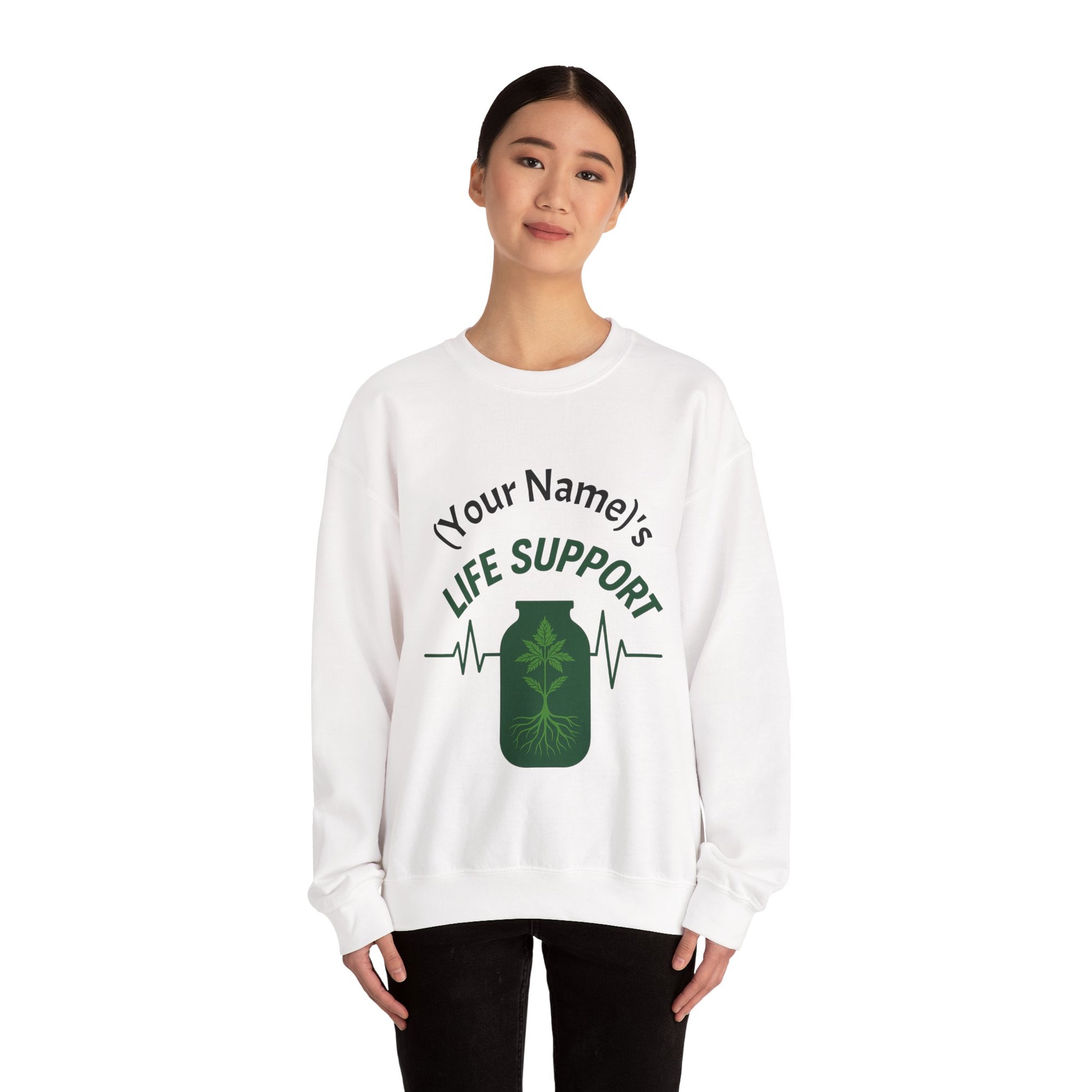 Soft, midweight comfort with a quiet green message. This crewneck sweatshirt features a hand-drawn bottle graphic holding a thriving plant and visible roots, with the handwritten "LIFE SUPPORT" headline above. Wear it on cool mornings while tending houseplants, walking city streets, or layering for a weekend of low-key errands. The roomy, classic fit and crew neckline let the artwork sit front-and-center while the durable double-needle stitching and tear-away label keep the focus on comfort. Subtle eco-minded details — OEKO-TEX dyes and ethically grown cotton — match the design’s gentle nod to growth and care.