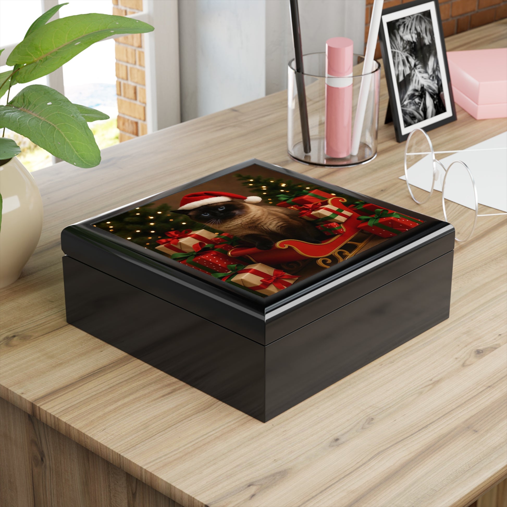 Adorable holiday cat photo featuring a fluffy cat in a Santa hat sitting in a Christmas sleigh surrounded by wrapped presents and glowing tree lights. Perfect for festive décor, seasonal marketing, or cute holiday content.